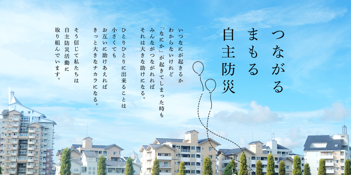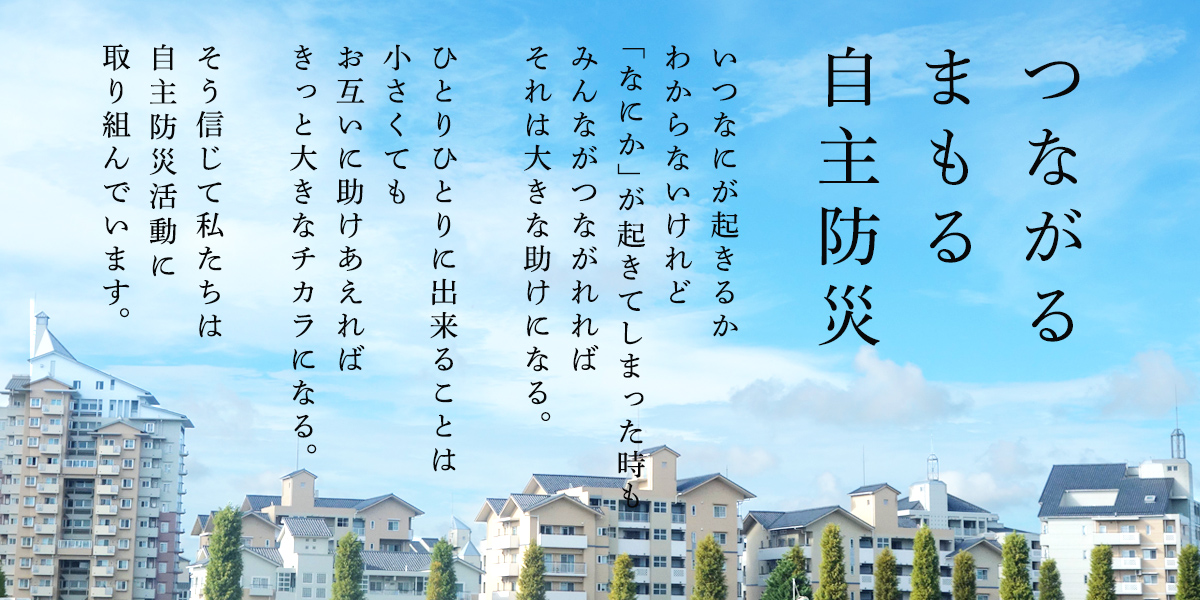 このホームページを通じて、行政等地域の情報を迅速かつタイムリーにお伝えすると同時に、防災に関する情報もお伝えし、みなさんの日頃の備えにご活用いただき、当団地の防災力をより強化して参りたいと思います。ご活用のほど、よろしくお願いします。